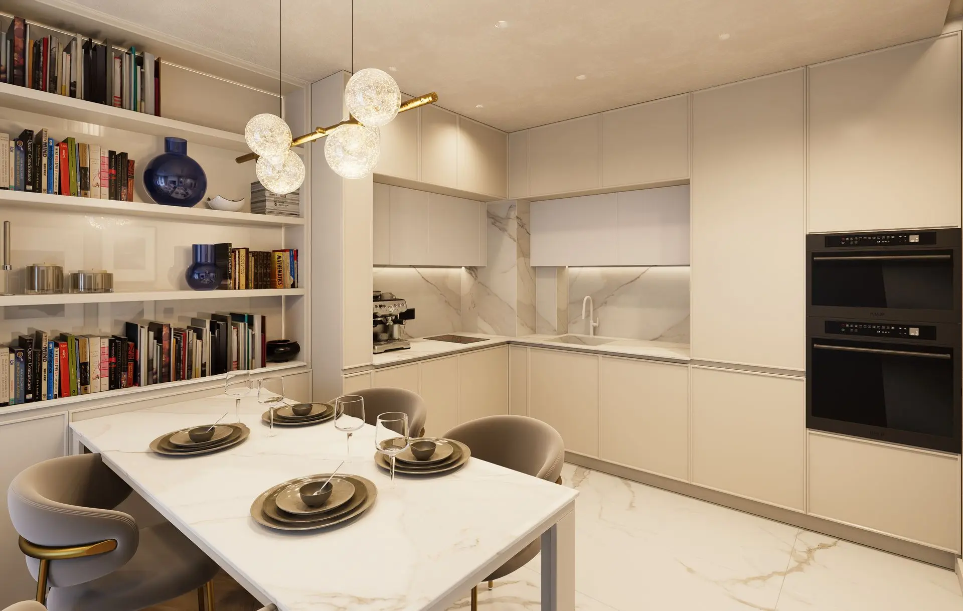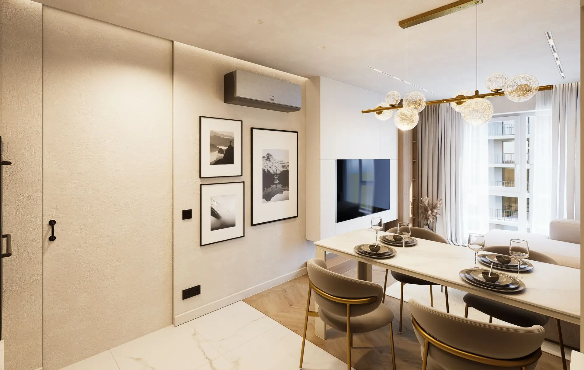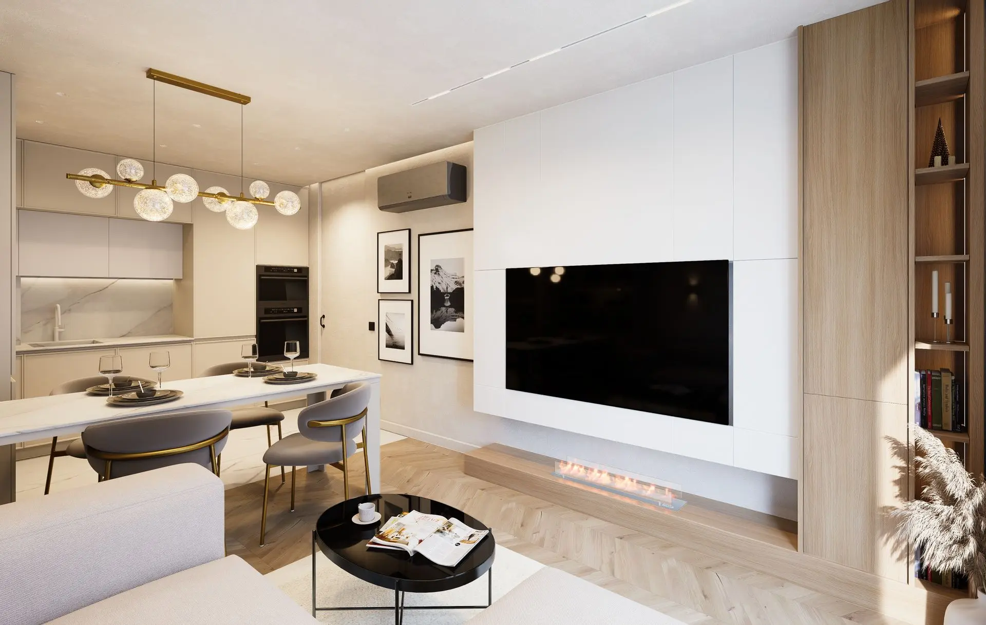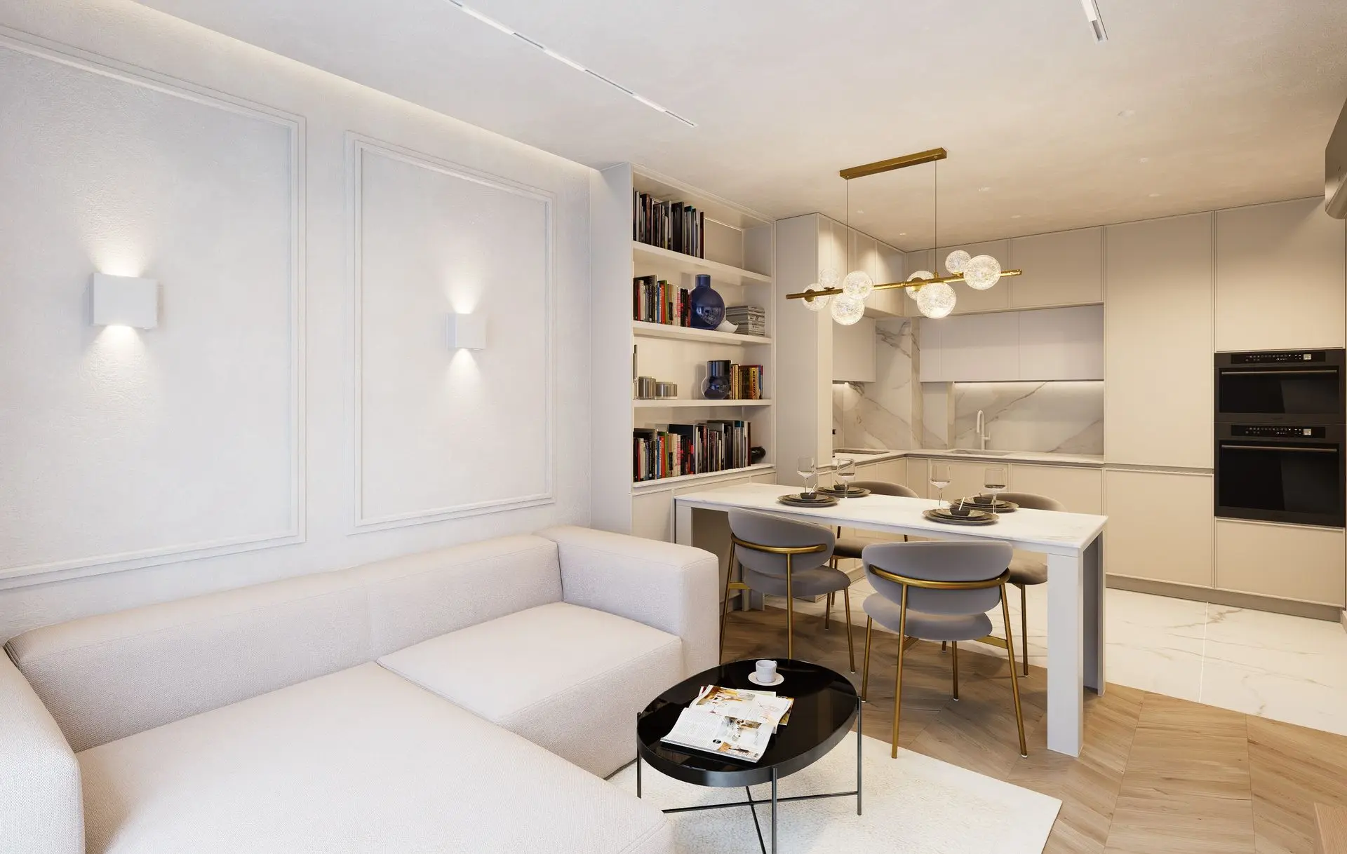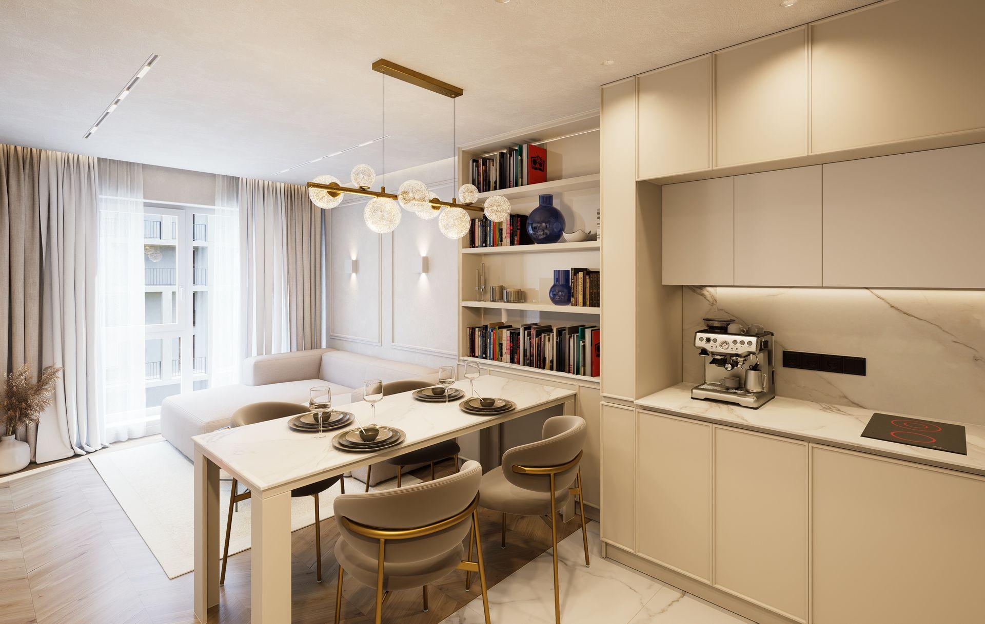 This luminous apartment combines elegance with comfort through a refined palette of soft neutrals, golden accents, and natural textures. The open-plan layout enhances the sense of space and flow between the kitchen, dining, and living areas. Sculptural lighting fixtures and built-in shelving add character and depth, while the bedroom offers a calm, sophisticated retreat with clean lines and carefully layered materials. The result is a bright, contemporary home with a timeless sensibility.