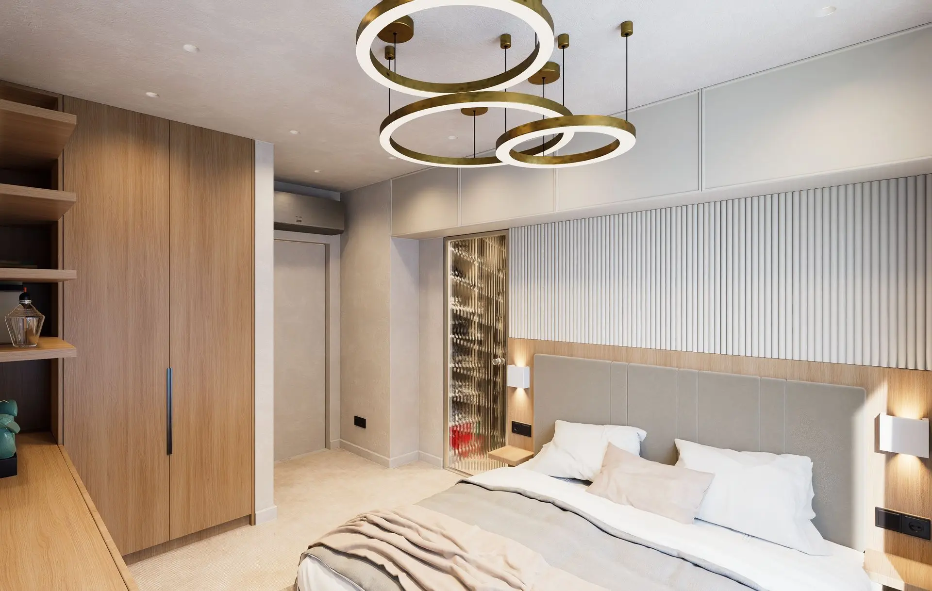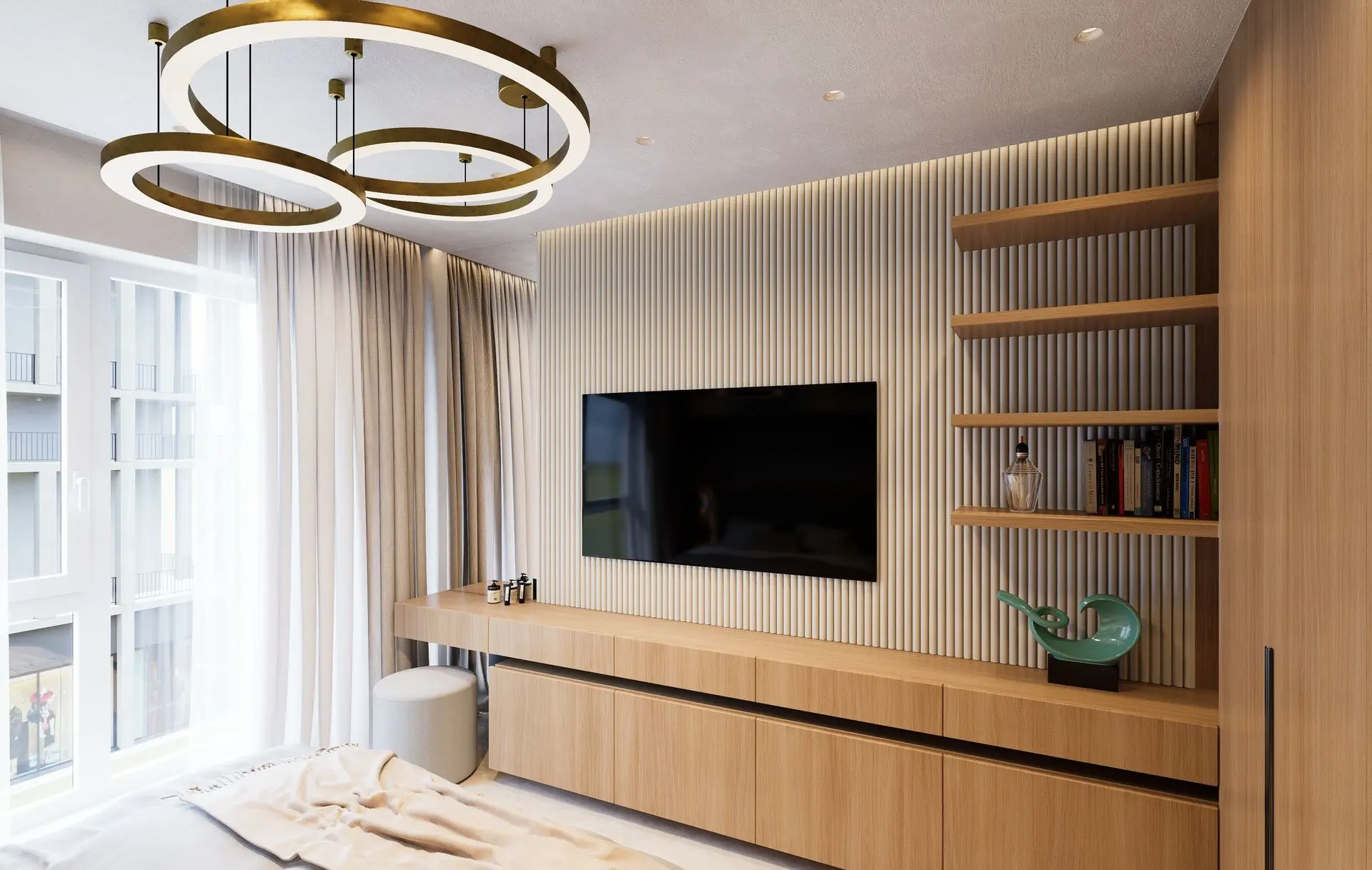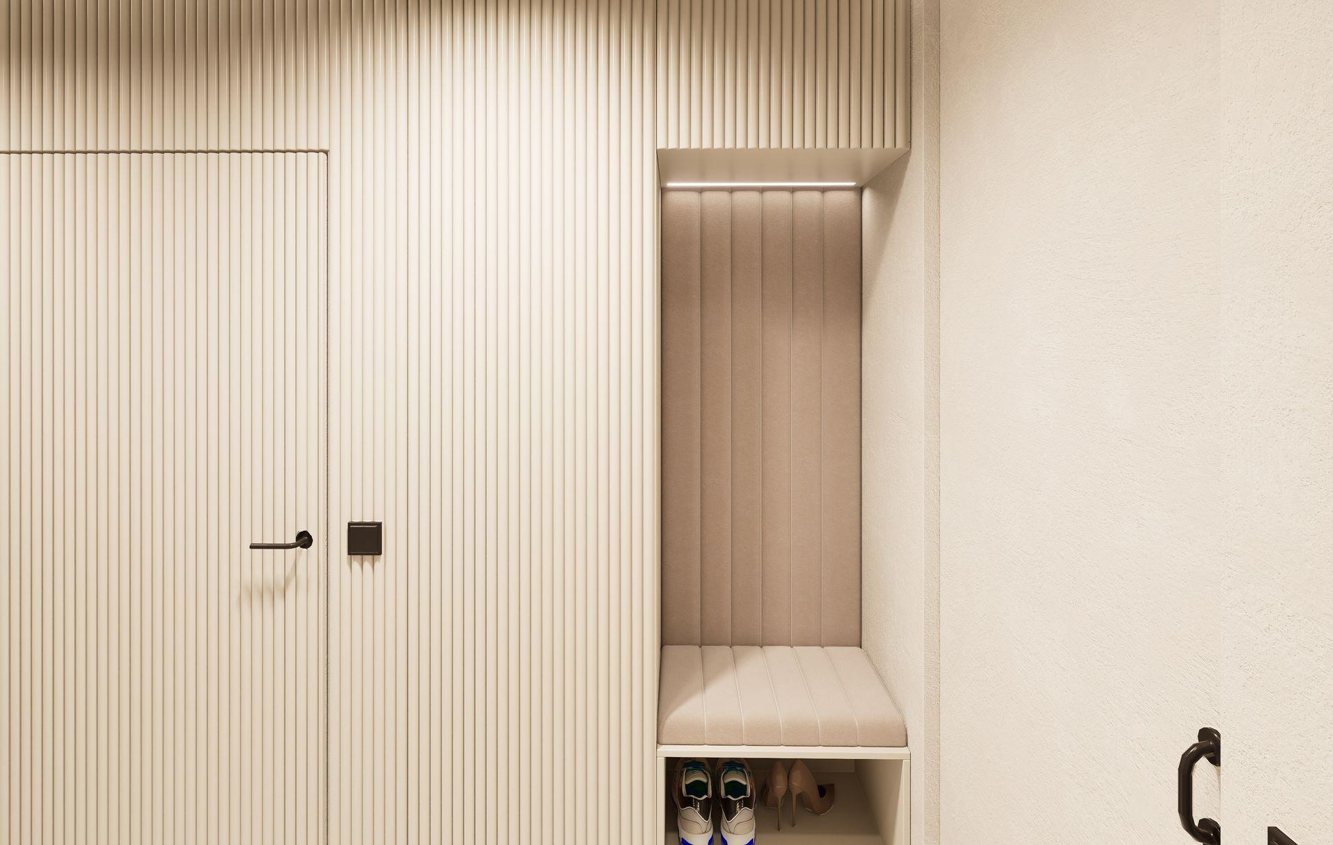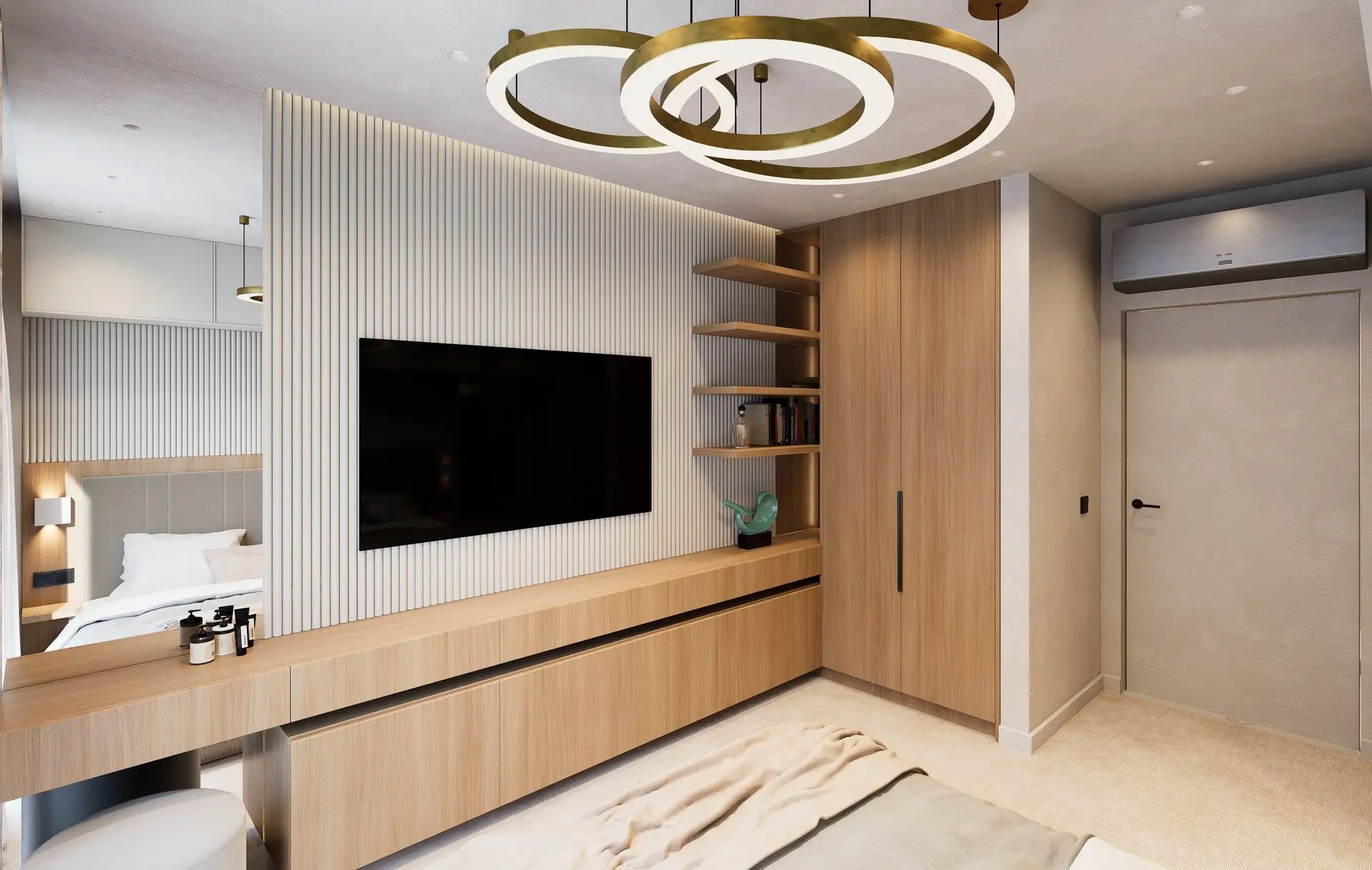This luminous apartment combines elegance with comfort through a refined palette of soft neutrals, golden accents, and natural textures. The open-plan layout enhances the sense of space and flow between the kitchen, dining, and living areas. Sculptural lighting fixtures and built-in shelving add character and depth, while the bedroom offers a calm, sophisticated retreat with clean lines and carefully layered materials. The result is a bright, contemporary home with a timeless sensibility.