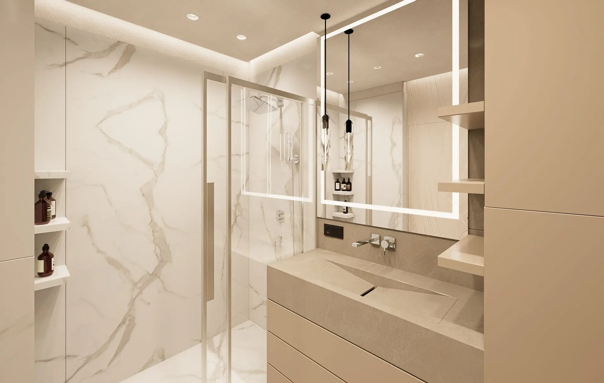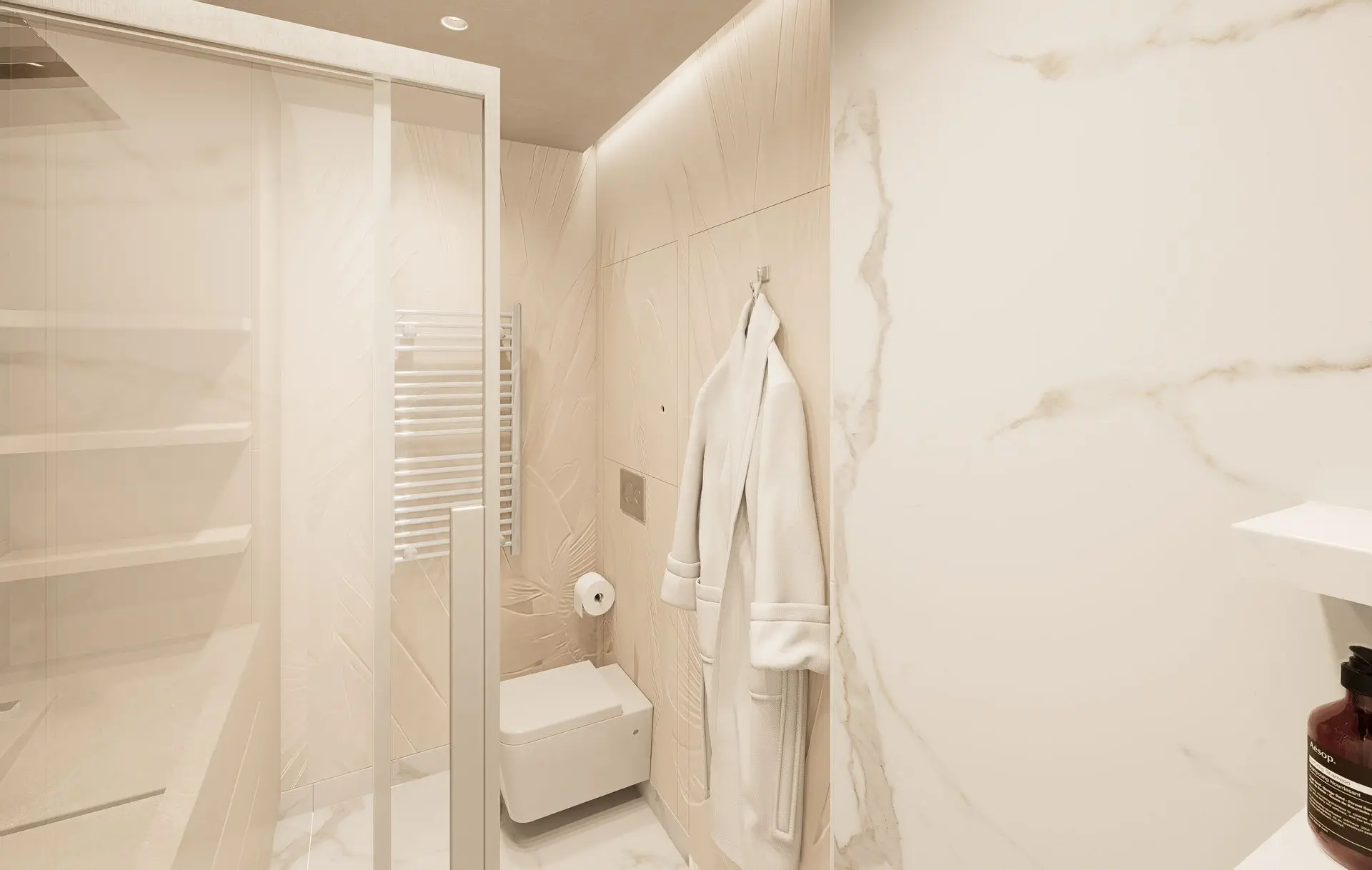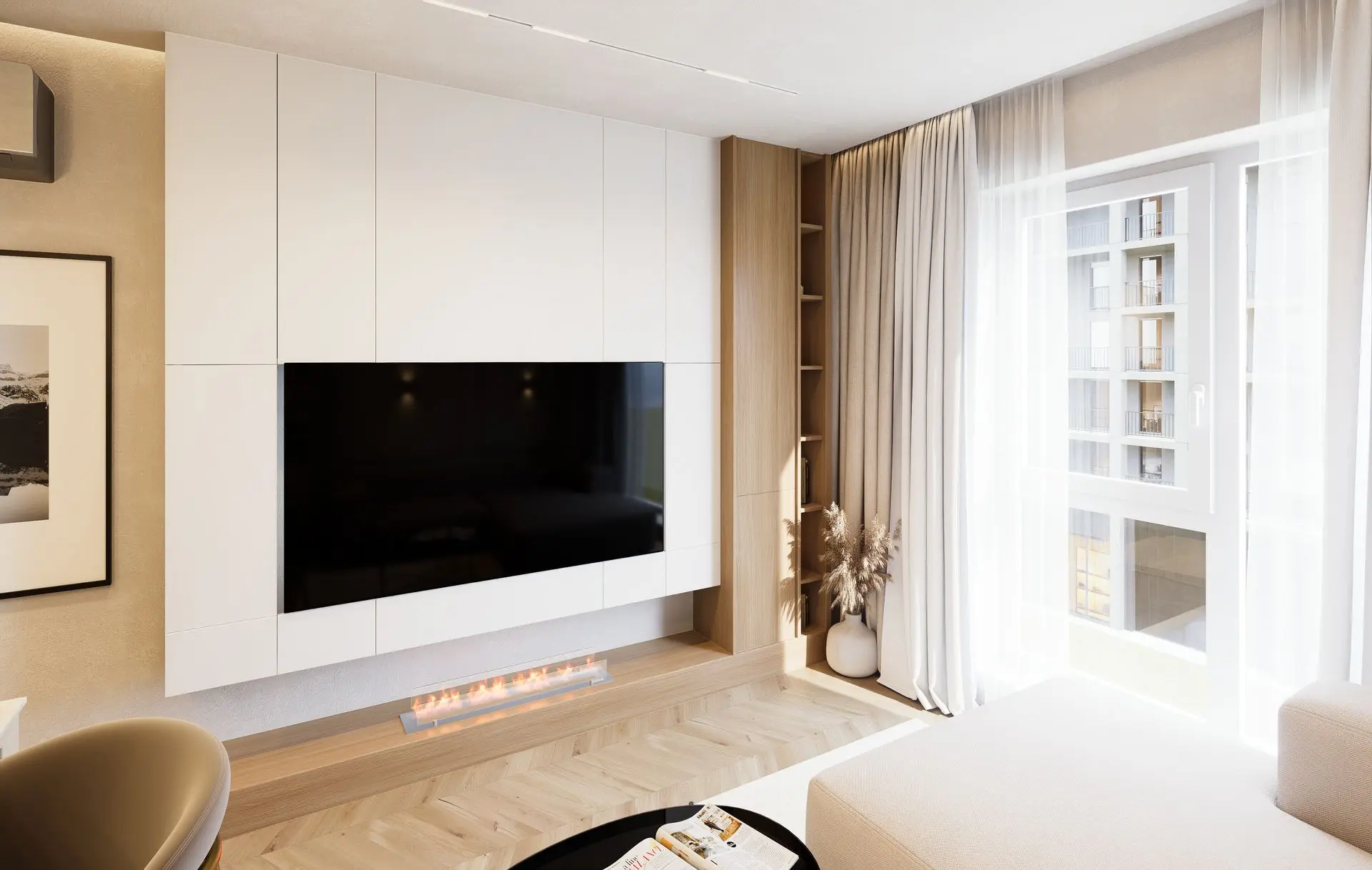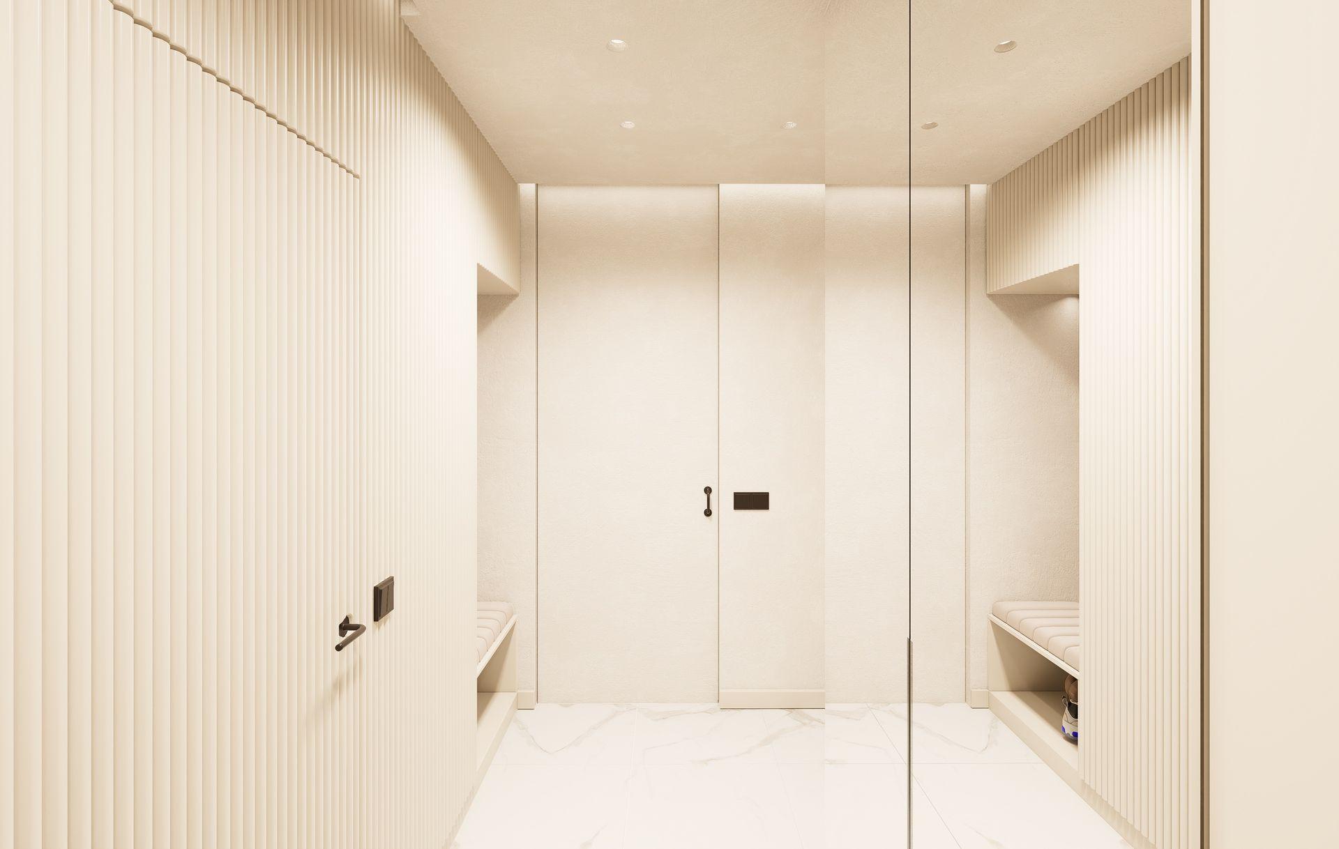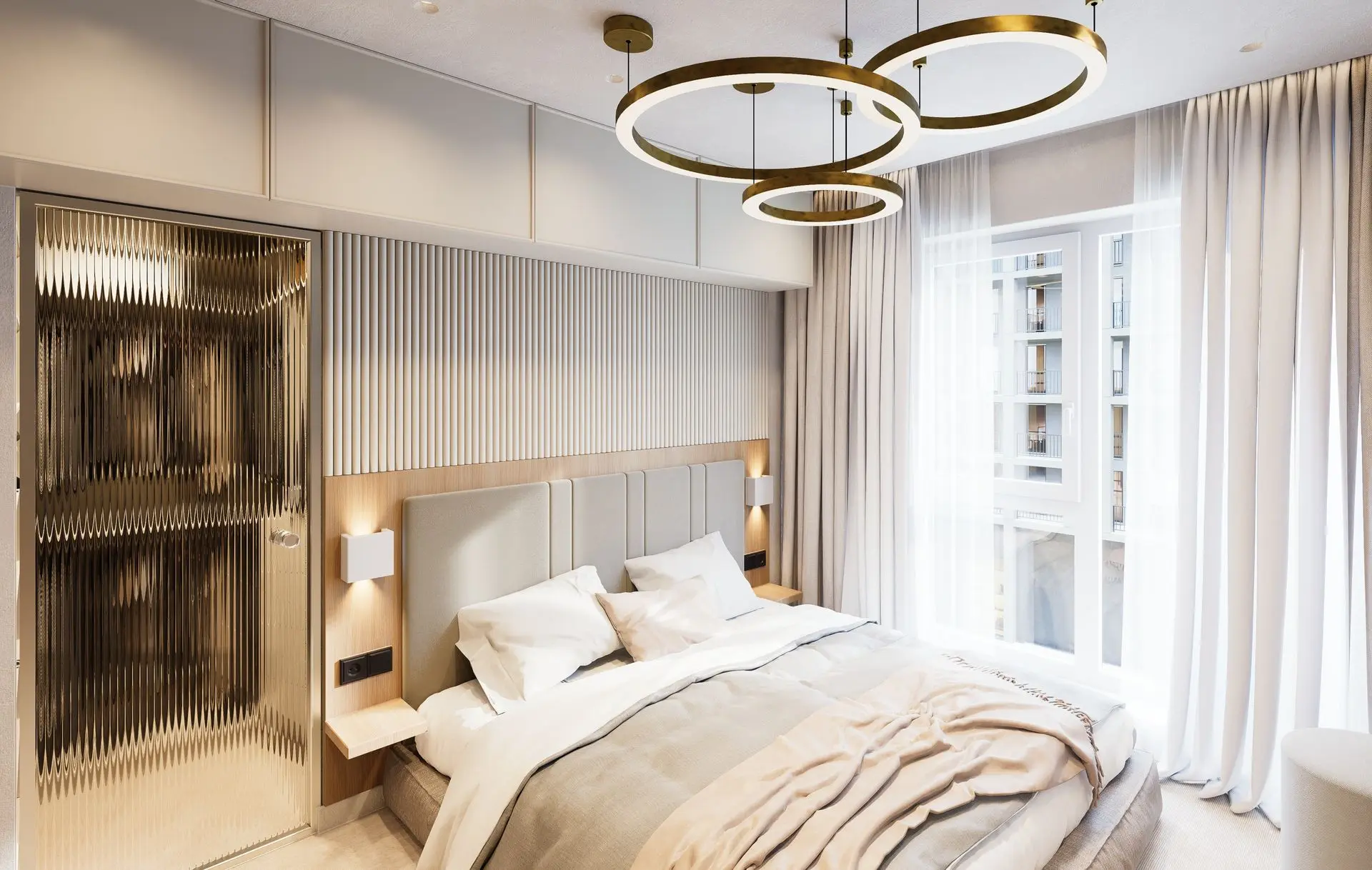 This luminous apartment combines elegance with comfort through a refined palette of soft neutrals, golden accents, and natural textures. The open-plan layout enhances the sense of space and flow between the kitchen, dining, and living areas. Sculptural lighting fixtures and built-in shelving add character and depth, while the bedroom offers a calm, sophisticated retreat with clean lines and carefully layered materials. The result is a bright, contemporary home with a timeless sensibility.