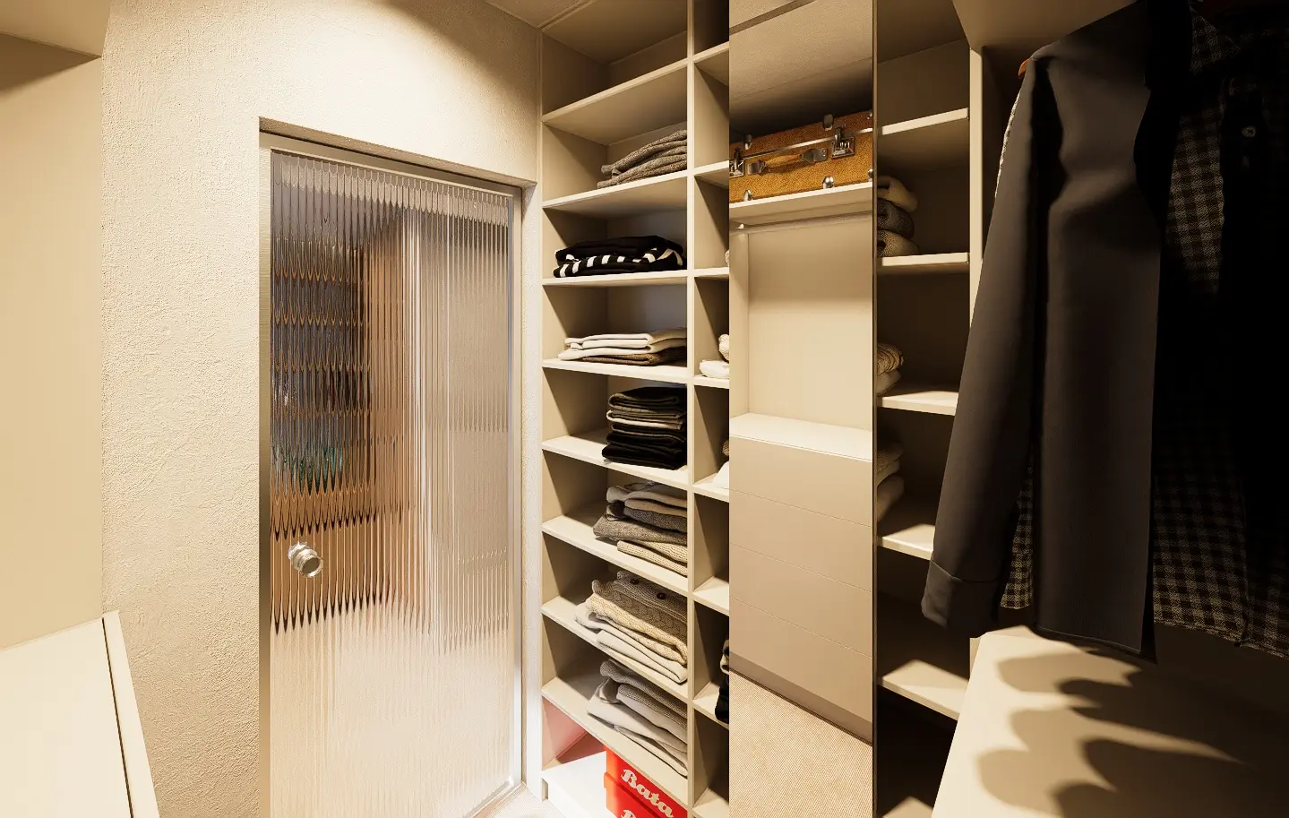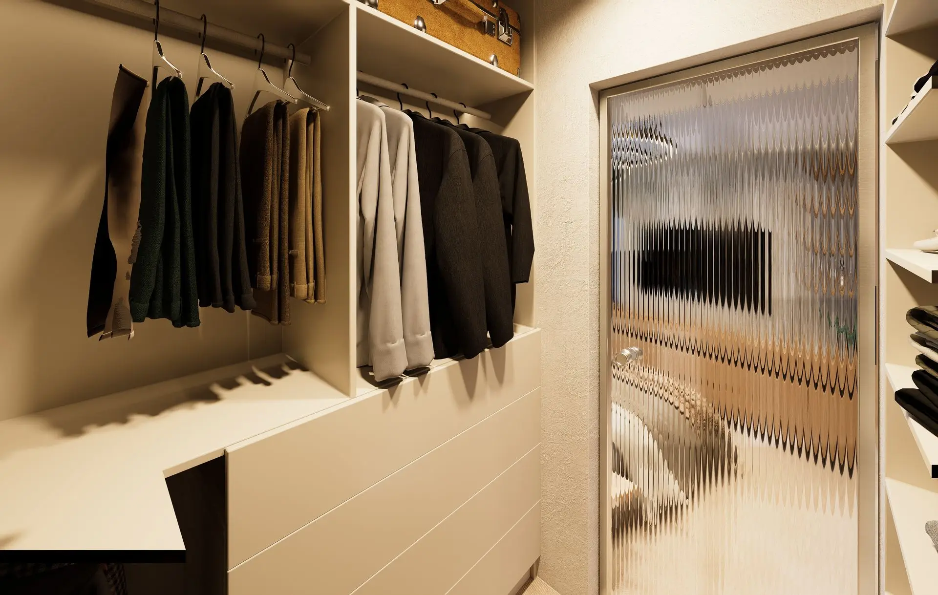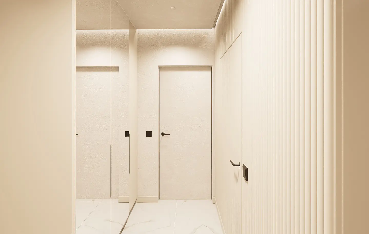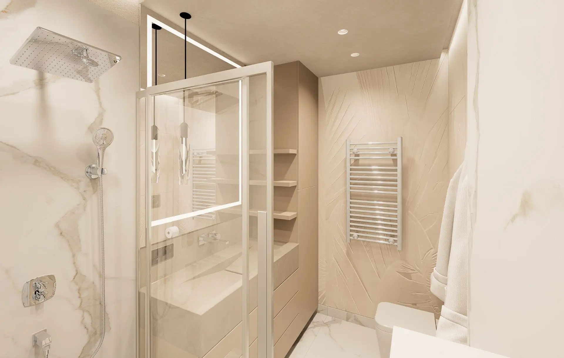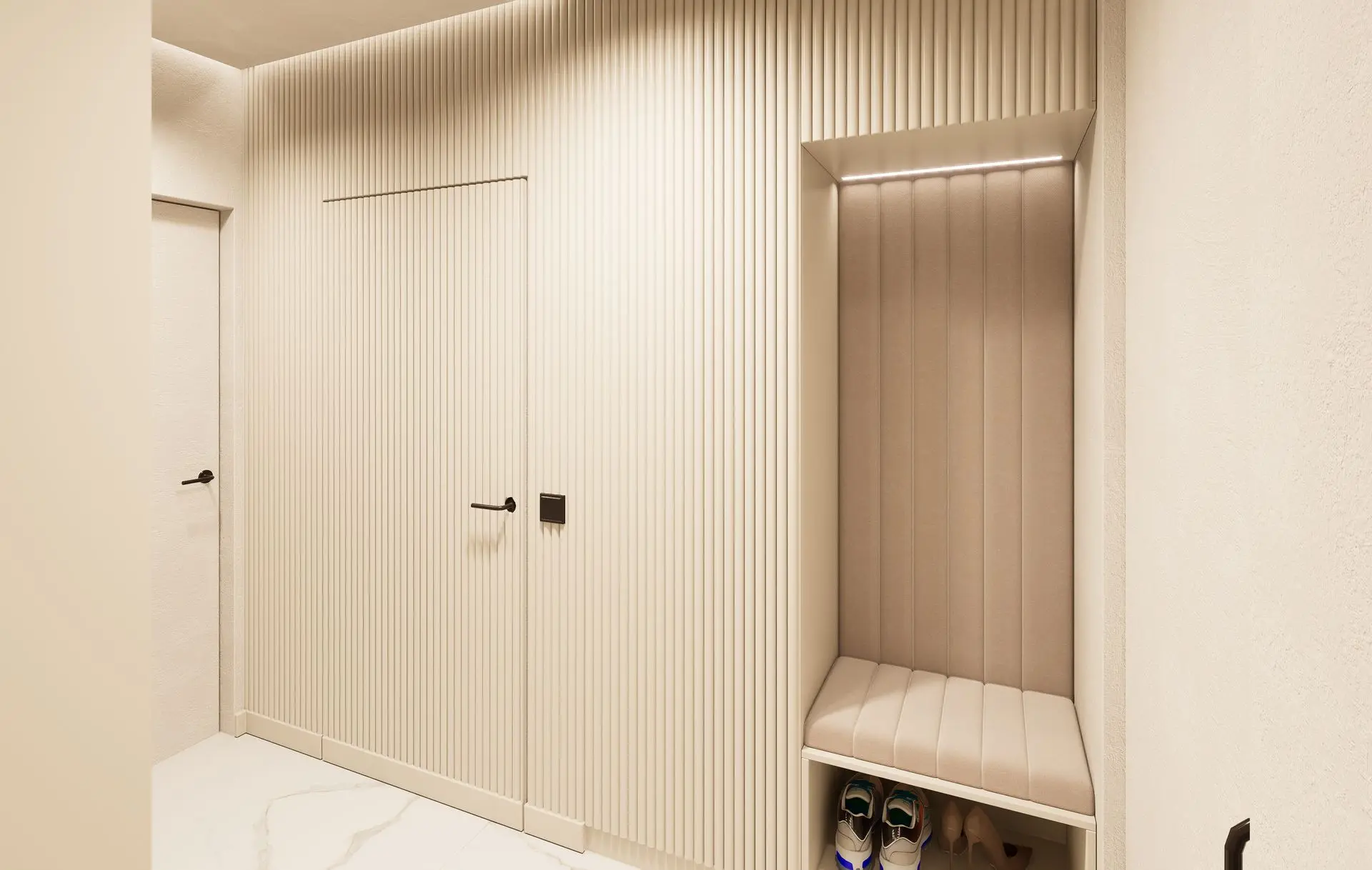 This luminous apartment combines elegance with comfort through a refined palette of soft neutrals, golden accents, and natural textures. The open-plan layout enhances the sense of space and flow between the kitchen, dining, and living areas. Sculptural lighting fixtures and built-in shelving add character and depth, while the bedroom offers a calm, sophisticated retreat with clean lines and carefully layered materials. The result is a bright, contemporary home with a timeless sensibility.
